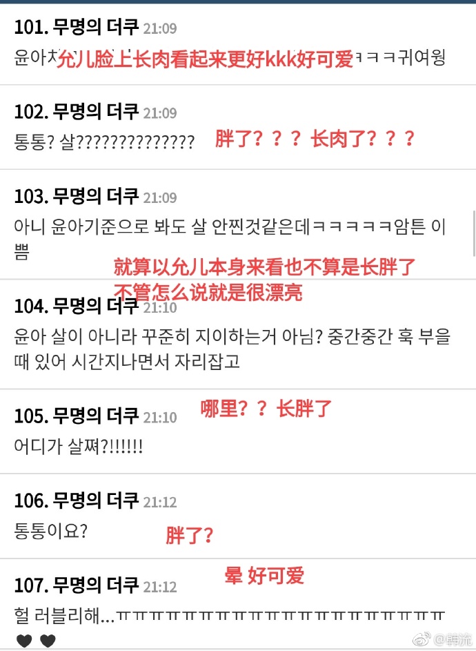 不過卻有眼尖的網友注意到,潤娥的臉頰比起過去凹陷的模樣似乎圓潤不少,雖然長肉了,卻引起網友一片稱讚,並紛紛表示「允兒(台譯潤娥)的臉上長肉了看起來更可愛」、「原來太瘦了現在也不算胖」、「允兒的基準這樣也不算胖」,看來成功增重的潤娥看起來氣色也變得更好。