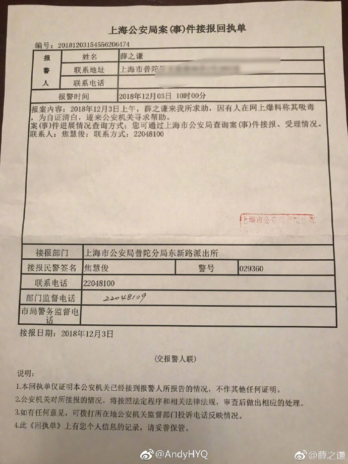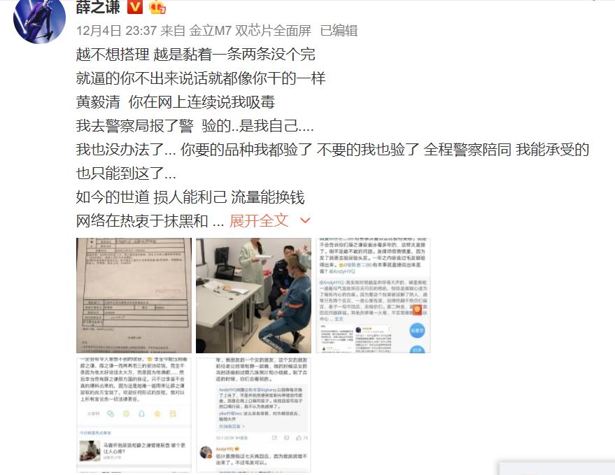 薛之謙面對子虛烏有的指控出面闢謠,更前往警局對黃毅清提告,4日,薛之謙在個人微博貼出「公安局案件接報回執單」和驗毒照片,並長文指名黃毅清千萬不要刪造謠微博。文中薛之謙向黃毅清喊話自己已經驗毒「你想要的品種我都驗了,不要的我也驗了,全程有員警陪同」,接著抨擊網路時代「流量能換錢,網路也熱衷於抹黑和辱駡,沒有人在意真相」,最後慎重宣布「我薛之謙從來不吸毒,任社會監督,若有虛言,當眾自盡」。