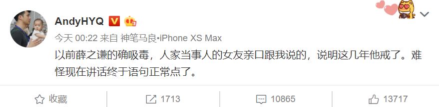 近日,大陸網路名嘴黃毅清在自己微博上針對藝人染毒風波連續發文評論,包括對「羽泉」歷經染毒事件分裂的兄弟情誼,接著更拉出薛之謙也染毒黑料。文中黃毅清直言「我是不會告訴你們薛之謙吸冰毒多年的,這樣太直接了」,接著還認為薛之謙一年內絕對有吸毒並表示「發律師信需慎重,因為發了就要去驗尿驗頭髮,一年之內吸食過毛髮都驗的出來」。