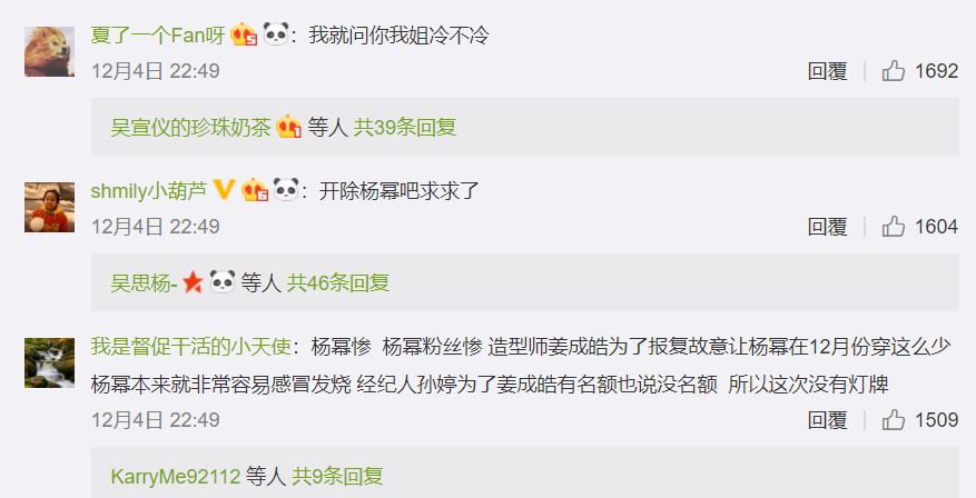 4日,時尚雜誌《時尚先生》在北京舉辦年度活動「MAHB年度先生盛典」,當日眾星雲集包括陳喬恩、周東雨、楊洋等人都到場共襄盛舉,其中楊冪一出席布料極少的洋裝立刻成為外界討論焦點。照片中,楊冪不畏零下低溫,平口洋裝不僅露出白皙鎖骨和香肩,下半身開高衩的設計更是露出招牌大長腿,雖然造型漂亮不過卻讓粉絲直呼「我就問你楊冪冷不冷」、「楊冪本身就容易發燒感冒」,引起外界指責造型師失責。