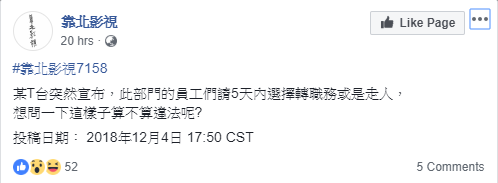 接著昨天又有疑似《食尚玩家》的工作人員在臉書「靠北影視」爆料,「昨天宣布資遣,禮拜五就要大家走!這種無良企業!祝你的女X日記可以一直寫下去。」還有另一人發文表示:「某T台突然宣布,此部門的員工們請5天內選擇轉職務或是走人,想問一下這樣子算不算違法呢?」
