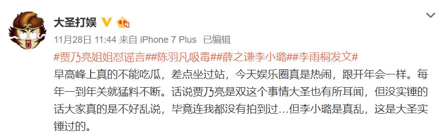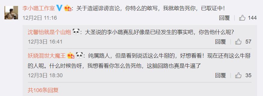 微博知名博主「大聖打娛」就針對此事發表評論,首先表示「賈乃亮是個雙」或許是謠言,不過李小璐私生活紊亂的確是事實,並直言到「李小璐是真亂,這是大聖實錘過的」。對此,李小璐工作室官方微博竟出面粗言回擊,並說到「關於造謠誹謗言論,你特麼的敢寫,我就敢告死你,已取證中」網友看到雙方論戰單感到相當震驚。