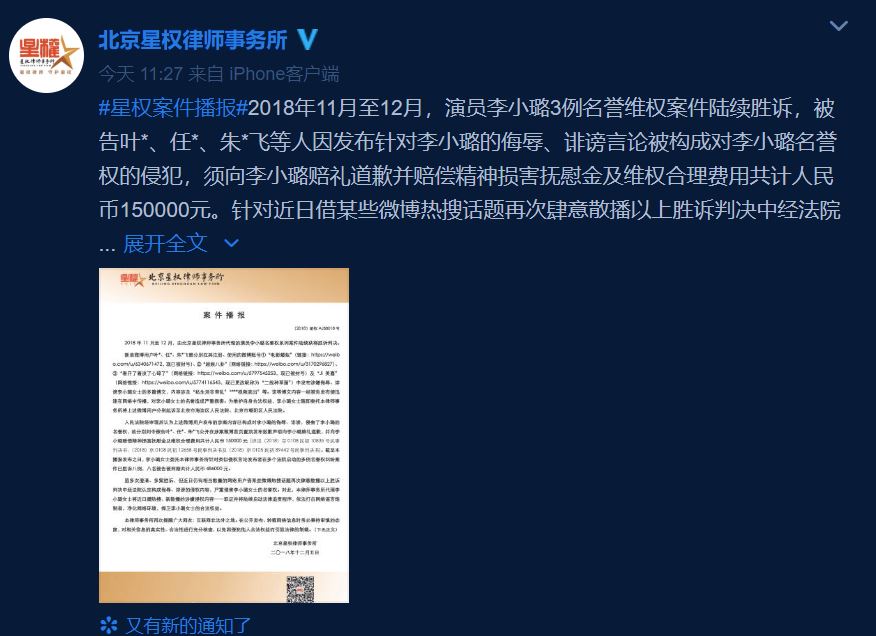 針對桃色醜聞,2月起李小璐就已經訴求法律協助,力求維護個人名譽,由於涉案者眾多導致訴訟案至今已持續10個月之久,10月初,李小璐首度勝訴獲賠33萬6600元人民幣。5日,北京星權律師事務所再度公告3例維權案勝訴,文中也明確指出「被告須向李小璐賠禮道歉並賠償精神損害撫慰金及維權合理費用共計人民幣15萬元」。