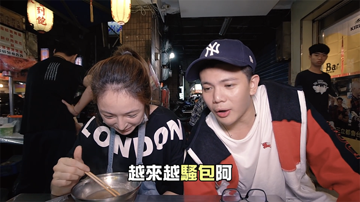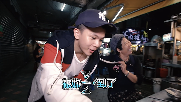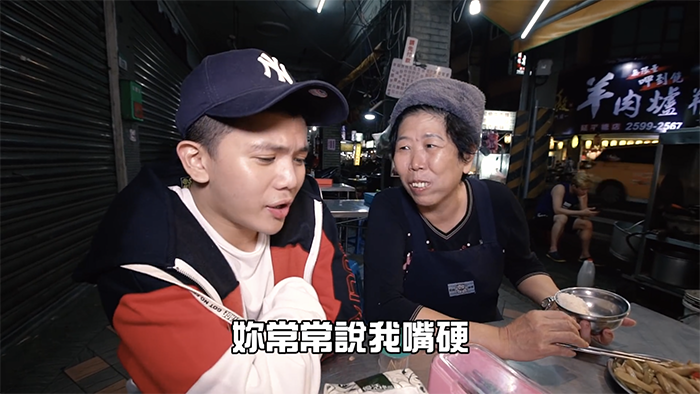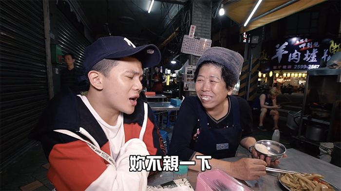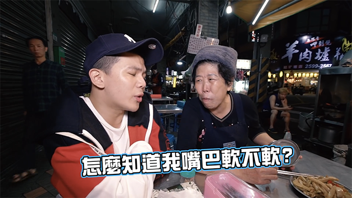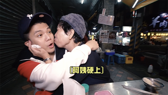 接著孫生開始撩年紀較大的阿姨們,他走近一位正在吃飯的阿姨說道:「阿姨,妳常常說我嘴硬,妳不親一下怎麼知道我嘴巴軟不軟」,聽完孫生這番話阿姨立刻捧起孫生的臉,大力的往他臉頰親下去,讓孫生嚇到直呼:「妳還真親啊」,更開玩笑的說:「被你ㄎㄧㄥˊ到了」,這番話也讓阿姨笑得合不攏嘴。