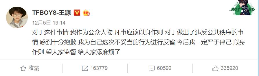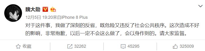 5日,王源和魏大勛發現事態嚴重終於發文道歉,並強調作為公眾人物已經深刻反省。王源在文中說到「對於這件事情,我作為公眾人物,凡事應該以身作則,對於做出了違反公共秩序的事情,感到十分抱歉」;而魏大勛則表示「我做了深刻的反省,既危險又違反了社會公共秩序。這次造成不好的影響,非常抱歉,以後一定不會這麼做了」同時,兩人也要求外界一起監督,道歉姿態擺得相當低。