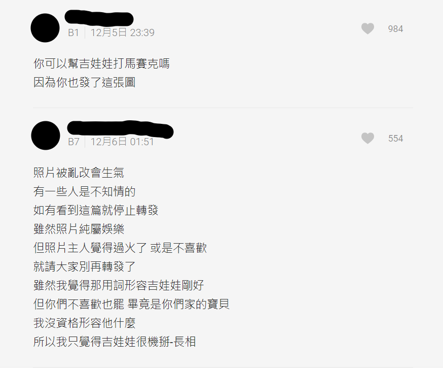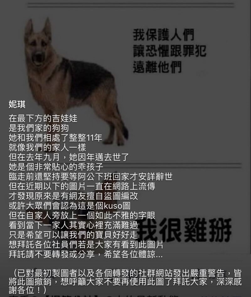 吉娃娃的主人在爆料公社上發文,內容說到:「在最下方的吉娃娃是我們家養的狗狗,她和我們相處了整整11年,就像我們的家人一樣,但在去年九月,她因為年邁去世了,她是個非常貼心的乖孩子,臨走前還堅持要等阿公下班回家才安詳離世,但在近期以下的圖片一直在網路上流傳,才發現原來是有網友擅自盜圖編改,或許大眾們會認為這是個kuso圖,但在自家人旁放上一個如此不雅得字眼,看到當下一家人其實心裡充滿難過,只是希望可以讓我們的寶貝好好走,想拜託各位社員們若是大家有看到此圖片,拜託不要轉發或分享,希望各界體諒...」文中字字充滿難過之意,讓人能體會到主人的悲痛。