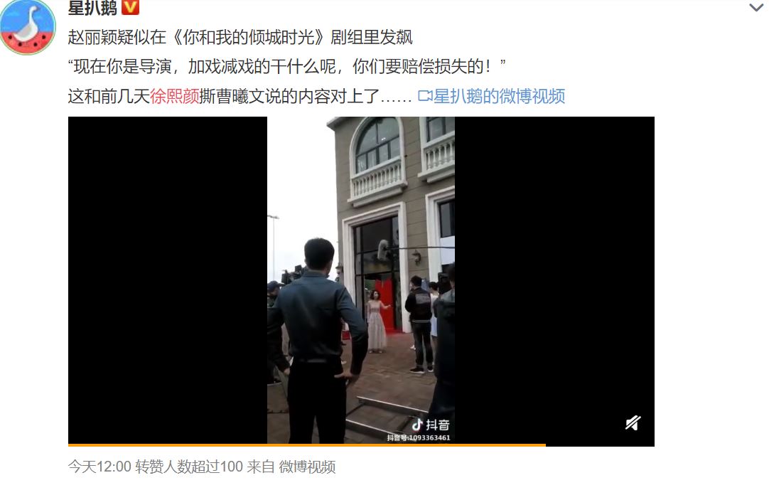 女演員趙麗穎和馮紹峰10月宣布結婚喜訊後兩人婚姻生活幸福美滿,愛情事業兩得意的她近期出演的作品《你和我的傾城時光》成為外界格外矚目的焦點。該劇目前持續熱播卻傳出女配角曹曦文私自加重戲份的消息,同劇演員甚至發文指控,6日網路上瘋傳一個影片,疑似趙麗穎在片場針對加戲事件發怒。