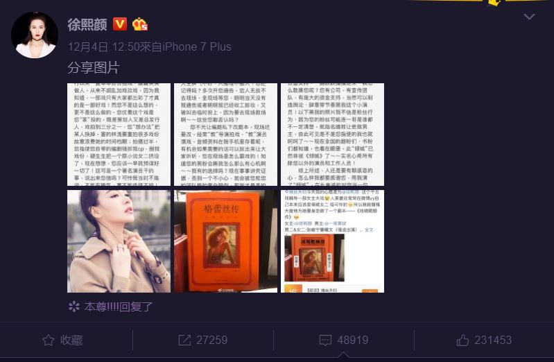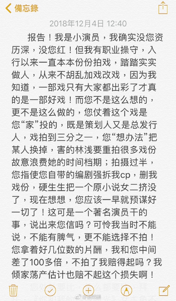 雖然曹曦文立刻出面否認謠言,4日,劇中演員徐熙顏卻發文證實曹熙文加戲事件,並羅列曹熙文在劇中的3個罪狀。文中首先表示曹曦文「仗著這個戲是您家投的」,接著表示曹曦文干涉劇本包括強行拆散原著中的CP、撤換角色讓趙麗穎得重拍,以及私下更改劇本,文末更諷刺說到「怎麼樣我都要感謝您用我演傾城」、「您不要隨意對號入座」,霸氣發文引起大批網友支持。