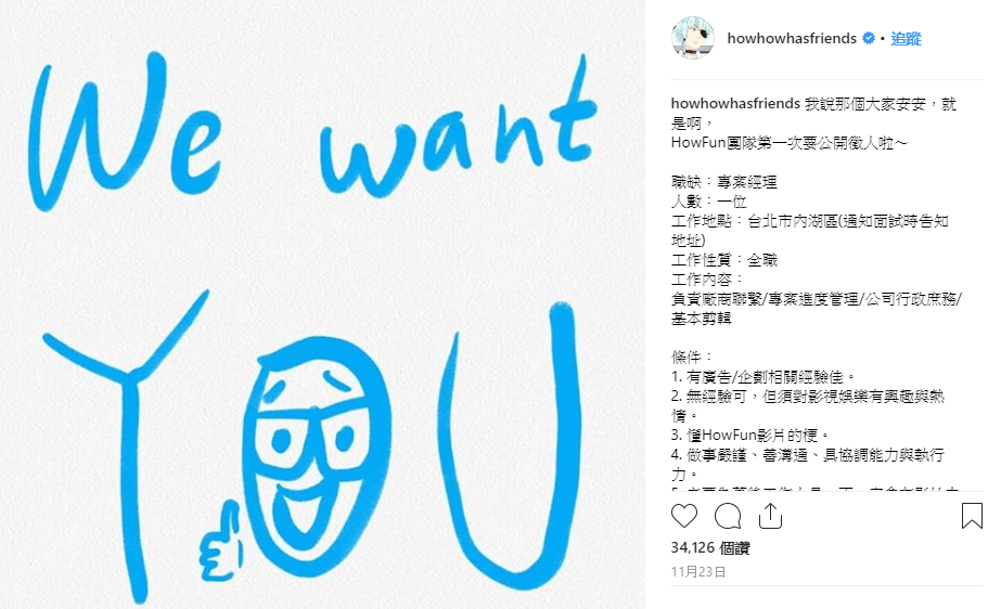 HowHow的團隊在今年加入了藍亦明,也讓許多粉絲笑稱他終於不是一個人拍片,而藍亦明木訥的形象也深受粉絲喜愛!沒想到上個月底HowHow突然在IG中發布徵人訊息,讓許多喜愛他的粉絲相當驚喜!