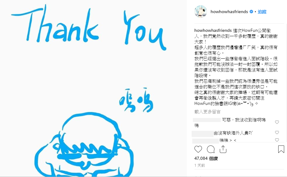 而昨(6)日HowHow便在IG中表示自己已經收到上千封的履歷,看得出來他十分意外,而他也開心表示:「超多人的履歷我們邊看邊ㄏㄏ笑,真的很有創意也很有心」,他們也已經選出一些應徵進入面試階段,How哥宇宙順利擴展!