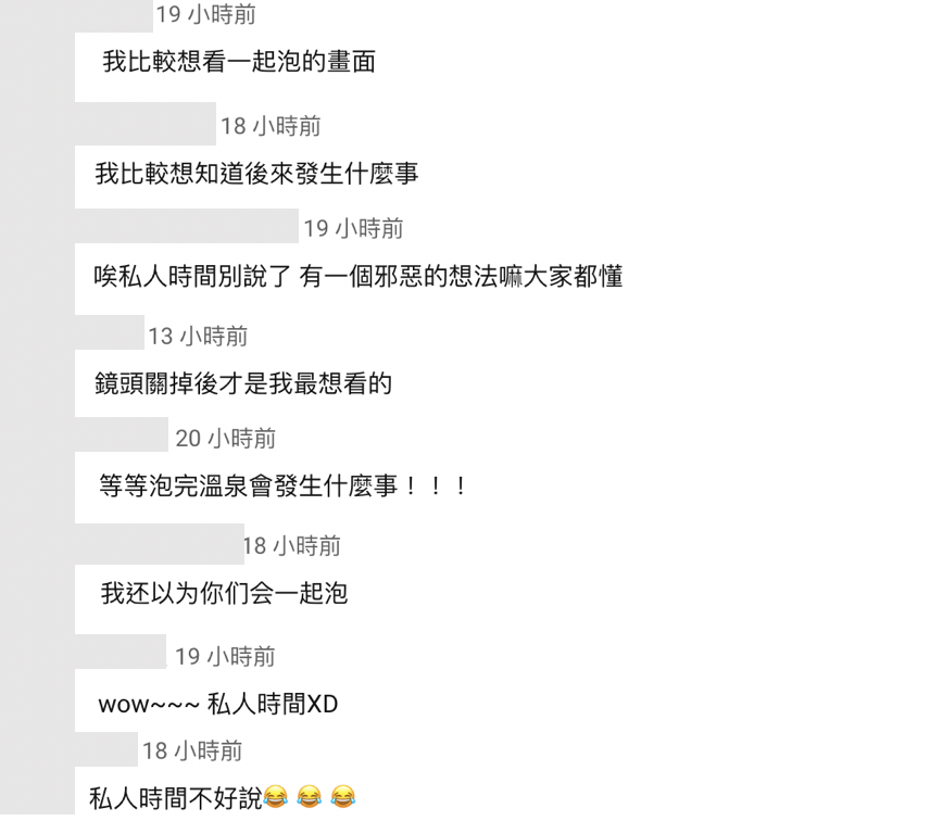 看完影片的網友也紛紛留言:「我比較想看一起泡的畫面」、「等等泡完溫泉會發生什麼事!」、「唉私人時間別說了 有一個邪惡的想法嘛大家都懂」、「我比較想知道後來發生什麼事」、「我還以為你們會一起泡」、「wow~~~ 私人時間XD」、「鏡頭關掉後才是我最想看的」、「私人時間不好說」
