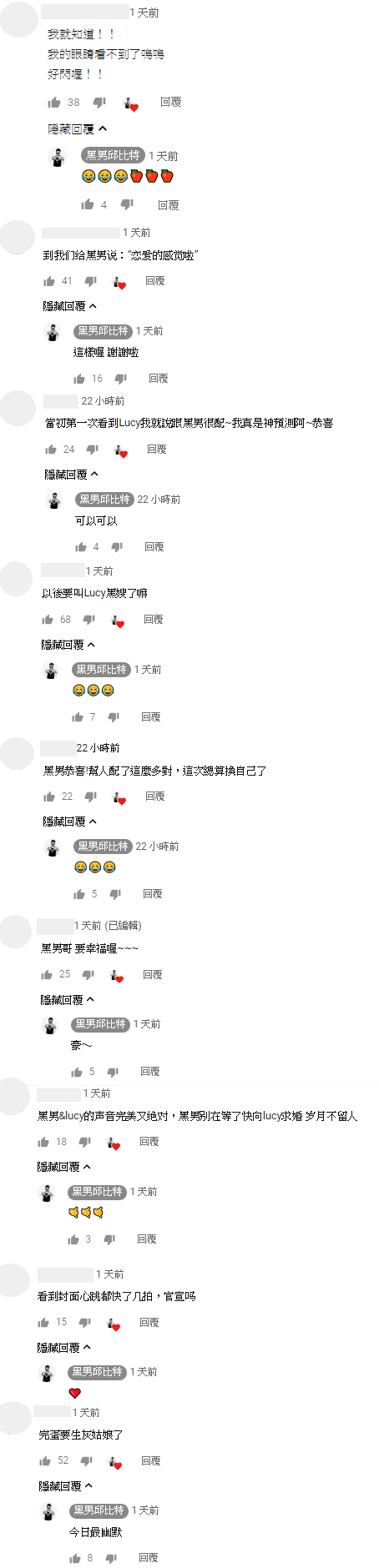 影片播出之後,許多網友紛紛留言:「我就知道!! 我的眼睛看不到了嗚嗚 好閃喔!!」、「到我們給黑男說:戀愛的感覺啦」、「當初第一次看到Lucy我就說跟黑男很配~我真是神預測阿~恭喜」、「以後要叫Lucy黑嫂了嘛」、「黑男恭喜!幫人配了這麼多對,這次總算換自己了」,從黑男的回覆看來,也幾乎認愛!