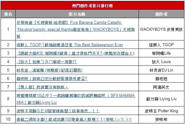 12/6於Google台灣-官方部落格,公布的Youtube2018年度熱門創作者榜單,從第十名到第一名的創作者,依序排名為:「安揪 咪」、「波特王 Potter King」、「劉力穎 Liying Liu」、「阿滴英文」、「廢宅妞」、「林良吉DJ Lin」、「放火 Louis」、「蔡阿嘎Life」、「這群人 TGOP」、「WACKYBOYS 反骨男孩」。