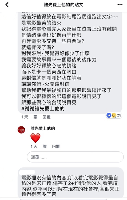 許多走入劇院的影迷,都是哭著走出電影院,《誰先愛上他的》揭露了看似不堪的背景,真正要告訴觀眾的是人生的無常、愛情的艱困、社會的悲劇,還有受到的壓迫、毫無保障的同志之愛。許多網友看了信件內容紛紛感動地說:「這信好值得放在電影結尾跑馬燈,是電影最美的結束。……謝謝你們公開這封信,幫我把我最後胸口的那股眼淚逼出來了,我可以很釋懷地跟這個電影說再見了,跟那些傷心的台詞說再見。」、「看完電影覺得最自私的是宋正遠,傷害了2+1個愛他的人,看完這內容,似乎可以理解在現在的社會裡,各個宋正遠過得有多辛苦。」