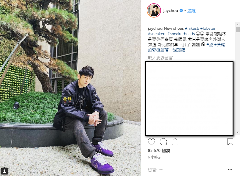 9日周董在個人IG上發文,內文除了放上周董腳穿搶眼紫色的nike球鞋之外,他也為自己的曬鞋作風霸氣回應,他說:「平常曬鞋不是要你們去買,去跟風,我只是要讓潮人老外知道,哥比你們早上腳了,謝謝」,看似短短的一段話卻是霸氣十足,內文的圖片裡還可看到周董的黑色夾克上寫著「榮耀」兩個字,讓人更覺得有弦外之音。