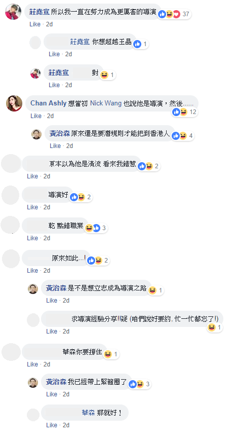 事情爆出之後,頑game的導演華森便於私人臉書中轉發了《台灣達人秀》的新聞,更直言:「是不是自稱導演都要潛規則別人阿?」,沒想到貼文一出,立刻引起許多其他知名網紅留言。只見香港網紅「Ashly老陳」便標記尼克打上:「想當初 Nick Wang 也說他是導演,然後......」,笑翻其他網友。