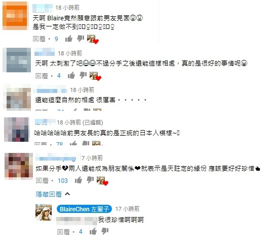 此影片上傳後,也引來網友熱烈討論:「天啊 Blaire竟然願意跟前男友見面,是我一定做不到」、「天啊 太刺激了吧 不過分手之後還能這樣相處,真的是很好的事情呢」、「還能這麼自然的相處 很厲害」、「哈哈哈哈前男友長的真的是正統的日本人模樣~」、「如果分手 兩人還能成為朋友關係 就表示是天註定的緣份 應該要好好珍惜」,對此Blaire也回應:「我很珍惜啊啊啊」