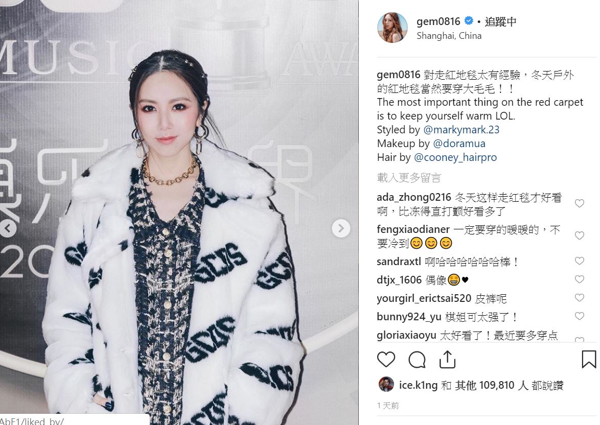 9日,鄧紫棋以入圍者身分參與電信公司中國移動舉辦的年度「音樂盛典咪咕匯」,當晚也在個人Instagram上分享穿搭照。照片中,鄧紫棋身穿黑色洋裝腳踩厚底高跟鞋,外罩的白色毛草大衣完全展現高貴氣息,不同其他女星以少布料的禮服現身紅毯,鄧紫棋在文中解釋「冬天戶外的地毯當然要穿大毛毛」,而粉絲也紛紛稱讚並表示「冬天紅毯這樣穿比凍得打直顫好看」、「一定要穿暖不要冷到了」、「好好看耶」。