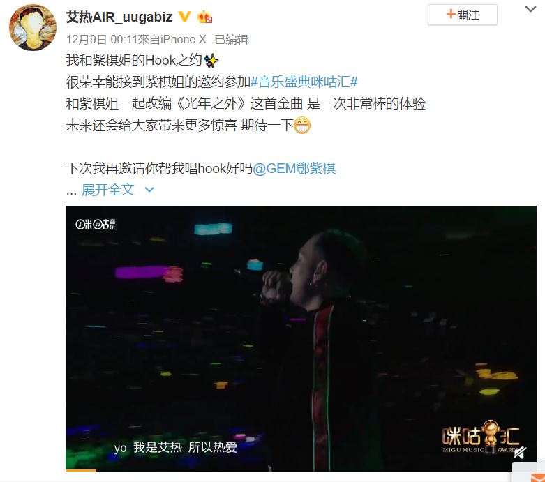當晚出席盛典的鄧紫棋也風光奪下三個獎項包括8月推出的新曲《倒數》獲得「年度十大金曲」、年度最佳女歌手,甚至是第三年獲得「最佳人氣女歌手」獎項。典禮當晚鄧紫棋和新說唱選手艾熱攜手演出歌曲《光年之外》,總算實現兩人在節目中的「Hook之約」,艾熱也發博文表示「和紫棋姐一起改编《光年之外》這首金曲 是一次非常棒的體驗」。