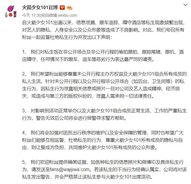10日,火箭少女經紀公司終於在官方微博發表「抵制私生飯聲明」,將對火箭少女私生活受擾的各種行徑提出應對舉措,也提供電子信箱鼓勵外界提供證據。文中譴責私生飯曝光火箭少女非公開場合的生活,此外也強調將訴諸法律途徑,並解釋「私生行為洩露相關資訊或照片一旦對公司及藝人造成精神、經濟損失,或造成與協力廠商的版權糾紛」,文末提供電子信箱希望外界提供證據,一起杜絕惡意行為。