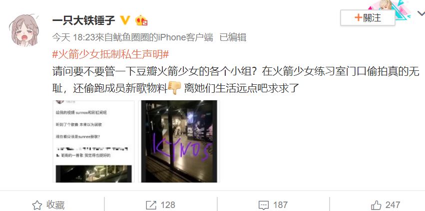 針對工作人員任意曝光火箭少女私生活,網友強烈指責火箭少女工作人員並舉報惡劣行徑表示「在火箭少女練習室門口偷拍真的無恥,還偷跑成員新歌物料」,網友更大批留言回應「公司裡的工作人員都是私生,先解決這個問題吧」「工作人員本來就是帶有粉籍的私生,專門偷跑不是自己pick的成員」。