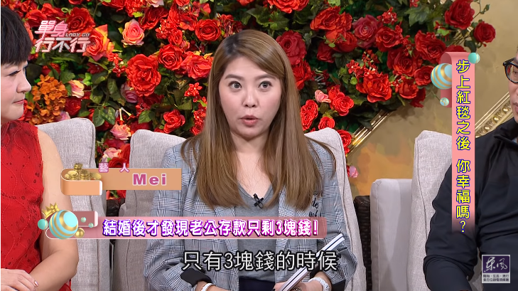 Mei(邱馨葦)與Energy成員阿弟(蕭景鴻)結婚多年,婚後生活幸福美滿的他們,其實背後有著一段艱苦的歲月。Mei近日在節目上透露,當年她和阿弟奉子成婚,結婚後老公存款只有3塊,夫妻倆開始為了錢而爭執,甚至吵到要離婚,直到因為她的身體出了狀況,老公才願意正視問題,「從男孩變成男人」。