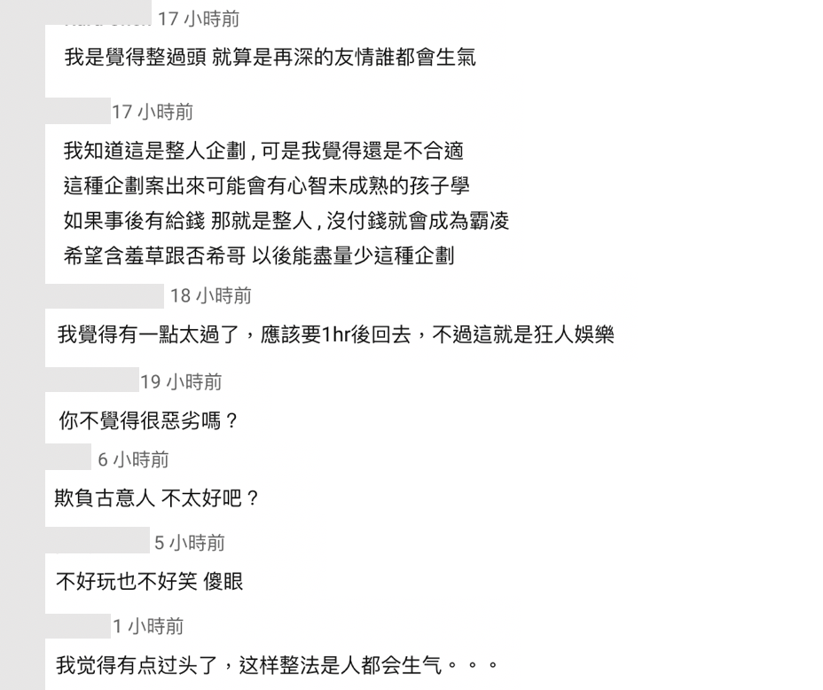 草爺在車上向否希提到:「弄他就算了,你這樣消費他,真的就過頭了,你一定會被網友罵」,然而,許多網友看完這部影片後也都認為這樣惡整古拉太過頭了,留言表示:「我是覺得整過頭 就算是再深的友情誰都會生氣」、「你不覺得很惡劣嗎?」、「我知道這是整人企劃 , 可是我覺得還是不合適,這種企劃案出來可能會有心智未成熟的孩子學,如果事後有給錢 那就是整人 , 沒付錢就會成為霸凌,希望含羞草跟否希哥 以後能盡量少這種企劃」、「我覺得有一點太過了,應該要1hr後回去,不過這就是狂人娛樂」、「不好玩也不好笑 傻眼」、「我覺得有點過頭了,這樣整法是人都會生氣…」、「欺負古意人 不太好吧?」