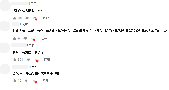 不過影片被PO上網之後,還是讓許多網友相當激動,紛紛留言寫道:「浪費衛生紙的影片」、「我們看的不是裸體 是若隱若現 是廣大無私的藝術」、「糞片,浪費我一個小時」、「襪子很醜都是套路」、「衛生紙很貴知不知道」。