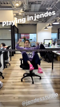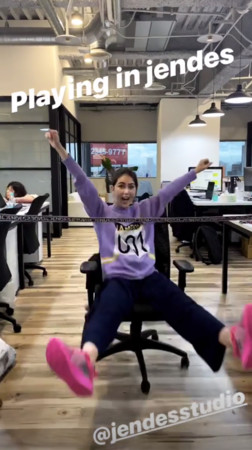 從昆凌所PO出的IG限時動態畫面中,可以看到昆凌紮起高馬尾,旁分斜瀏海襯托出她洋娃娃般的精緻臉蛋,川著輕便寬褲、紫色高領毛衣搭配桃紅布鞋,看起來輕鬆休閒。昆凌坐上椅子舉高雙手滑動辦公椅,前後滑動玩得超級開心;不過,引人注目的是,昆凌身後的辦公室明亮寬敞,木質地板更顯出格調與溫暖感,整體裝潢的部分主要偏向工業風,而正後方的大窗戶可以直視外景,辦公看起來相當舒服。