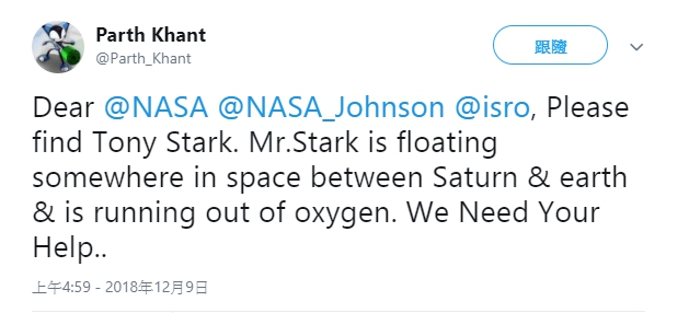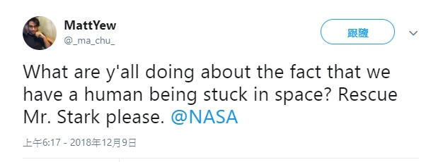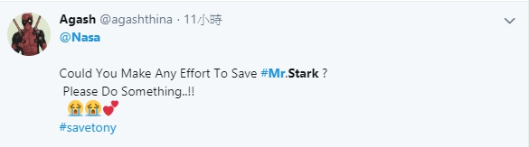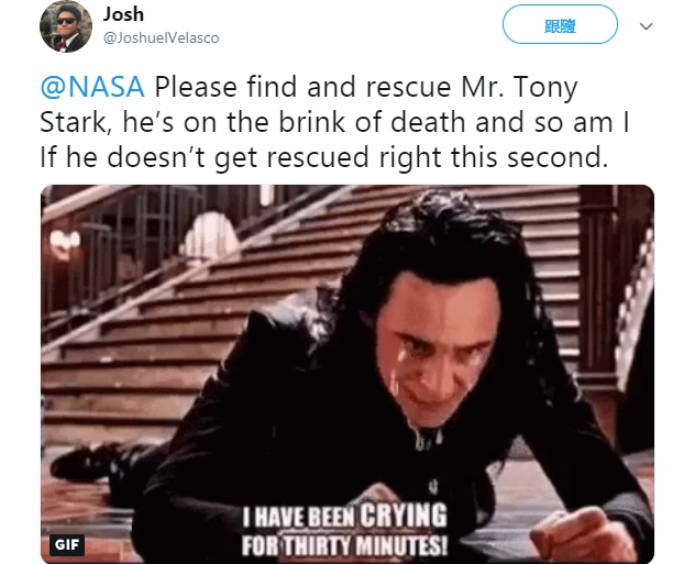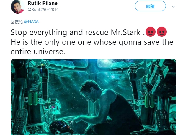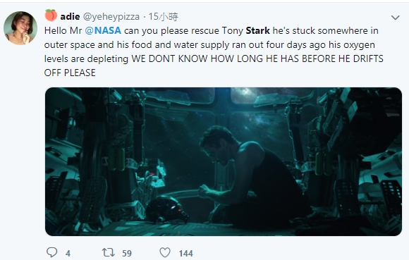 ▼許多漫威影迷都在推特上 Tag 美國國家航空暨太空總署 NASA,請求他們立刻去救援孤獨漂浮在外太空的鋼鐵人:「NASA 請協尋並救援東尼史塔克先生,他現在正面臨死亡邊緣」、「停止一切工作立刻去救東尼史塔克!他是唯一一個能夠拯救全宇宙的人」、「NASA請幫忙救出東尼史塔克,據我所知他現在正漂浮在地球和土星之間某處,他的氧氣快用完了,急需幫忙...」、「他是整個地球的救星,你不能讓他困在外太空中孤獨死去 NASA」。