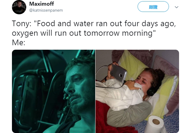萬眾矚目的漫威超級英雄主線大片續集《復仇者聯盟 4》(Avengers 4)終於在上周曝光了首支預告片,一開頭漫威就向影迷展現了極為虐心的一個畫面,剛在懷中親眼失去小蜘蛛人的鋼鐵人,心碎的他之後獨自漂流在外太空中,最終逐漸耗盡了水源和食物,他深信等到明天氧氣也用光之時,東尼史塔克將要迎接自己生命的盡頭。這一段全新曝光的預告劇情就已經讓許多粉絲哭斷腸,沒想到火速就在推特上引起一大片效應。