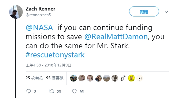 ▼甚至有網友笑說:「NASA 如果你們持續在執行拯救麥特戴蒙的任務,那麼你們也可以為東尼史塔克做一樣的事情。」