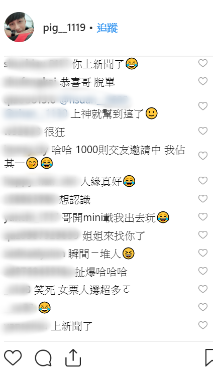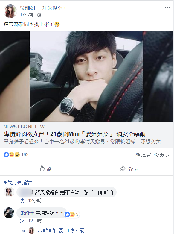 看到小鮮肉上新聞時,幫他PO文徵女伴的乾姊姊也在臉書上發文「媽我上新聞了!沒想到第一次上新聞是因為幫我弟徵女友」,也在下面的留言中提到自己沒想到會引起那麼大的轟動。同時,小鮮肉也前來留言「窩滴媽呀…」,可以看出他一時之間被多人追蹤的不知所措。