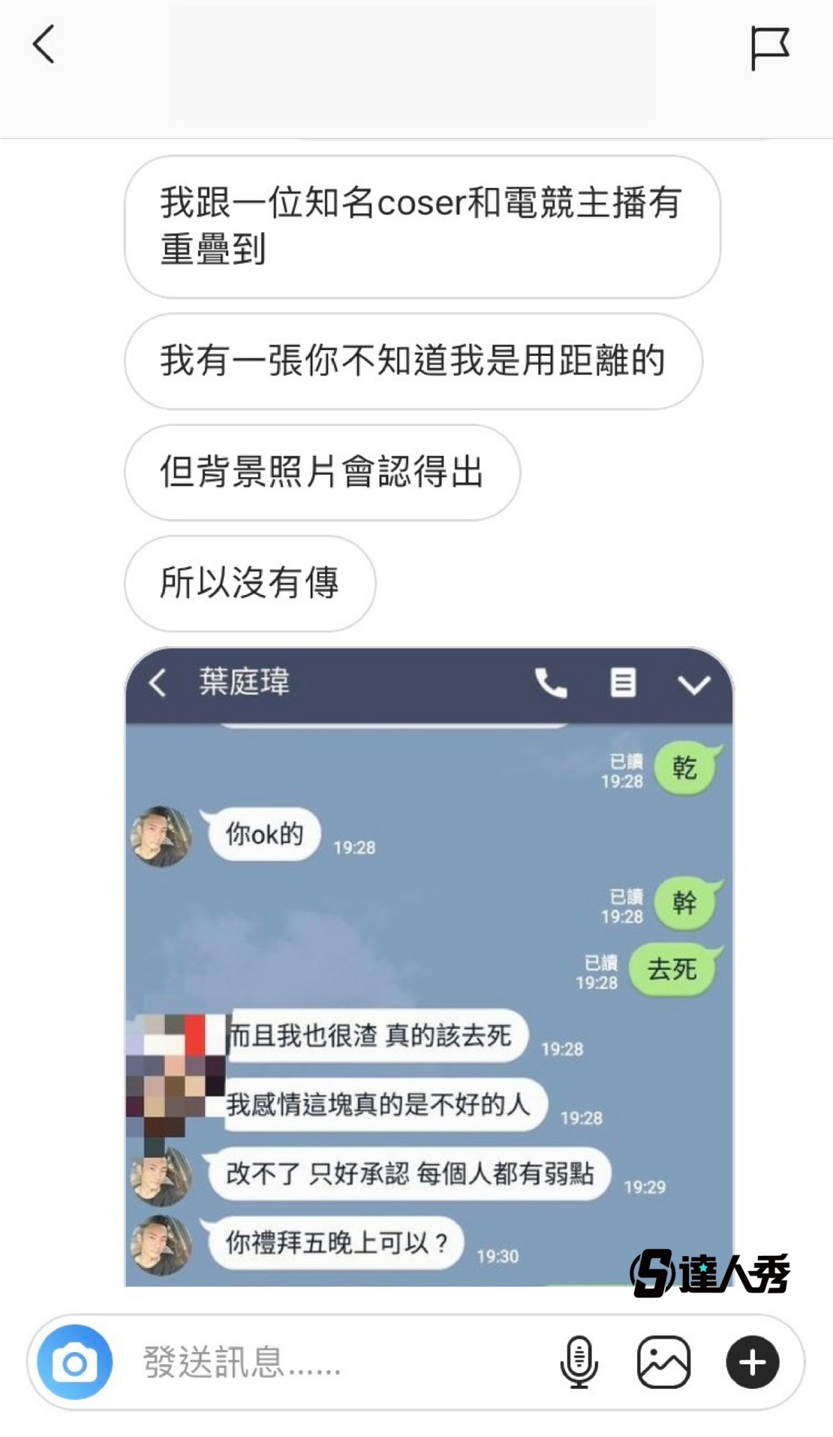 此外爆料者也透露,葉公約炮的對象包含多位知名coser、電競主播以及一名韓國女生,在逼問之下,葉公則坦承自己「我也很渣,真的該去死,我感情這塊真的是不好的人,改不了,只好承認,每個人都有弱點」。