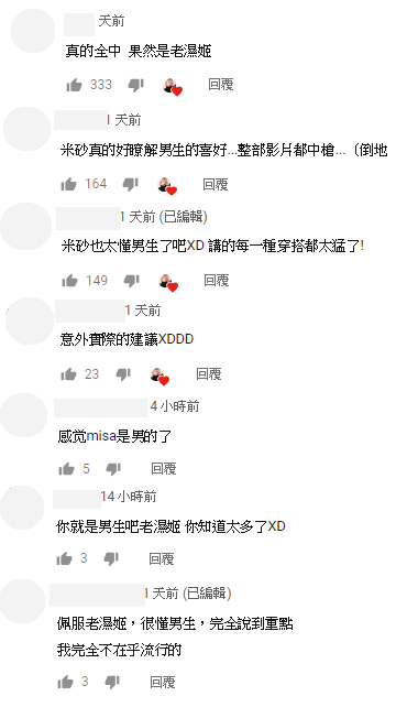影片上傳之後,許多網友紛紛留言:「真的全中,果然是老濕姬」、「米砂真的好了解男生的喜好...整部影片都中槍」、「米砂也太懂男生了吧XD 講的每一種穿搭都太猛了」、「意外實際的建議」、「感覺米砂是男的了」、「你就是男生吧老濕姬」。