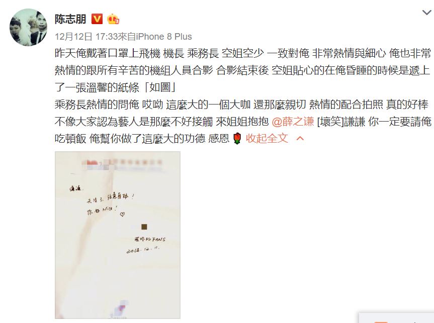 藝人出門不免需要戴上口罩事實上總是難掩鋒芒,然而最尷尬的狀況莫過於被路人認錯。近期因為工作需要中台兩邊跑的前小虎隊成員陳志朋,戴著口罩登機的他收到空姐貼身服務,不料最後收到空姐的告白紙條,才發現原來是一場認錯人的烏龍,12日,陳志朋也將整起烏龍事件在微博公開了。