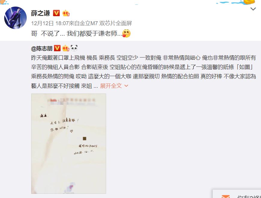 陳志朋事後發文時還特別標記薛之謙本人微博,並邀功說到「你一定要請俺吃頓飯,俺幫你做了這麼大的功德,感恩」。對此,薛之謙也在微博分享該則貼文,甚至幽默化解尷尬表示「哥,不說了,我們都愛于謙老師」兩人有趣互動引起網友討論。