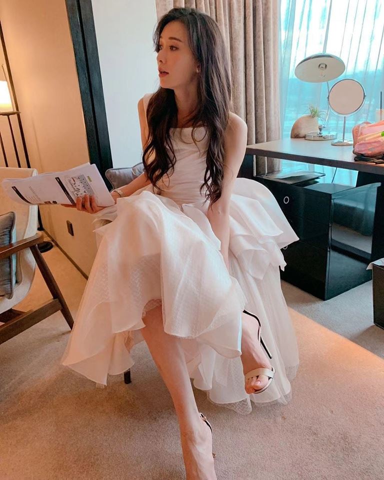 照片中,林志玲一頭飄逸的波浪長髮,襯托出她小巧的瓜子臉蛋,讓五官看起來更加立體。只見林志玲穿著一身俏麗的短版白紗,纖細嫩白的小腿搭配裸色的高跟鞋,女人味十足。