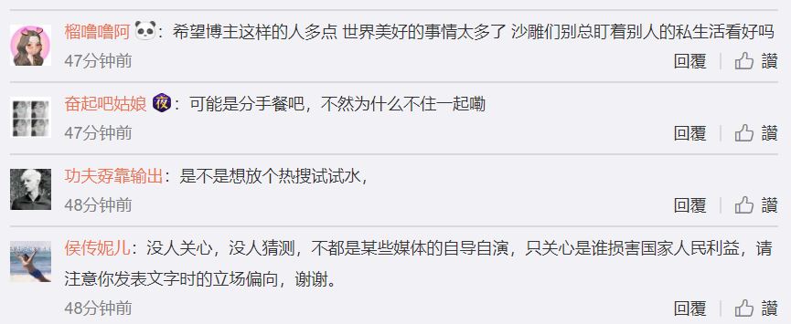 然而卻也有一派網友捕捉到兩人用餐後,助理和范冰冰搭車便和李晨分頭兩路回家了,似乎看不出兩人感情密切並說到「狀態很明顯了,吃完飯後各自回家」、「分手餐吧,不然為什麼不住一起」,不過也有網友護航表示范冰冰私生活不斷受打擾,希望外界給予兩人空間。