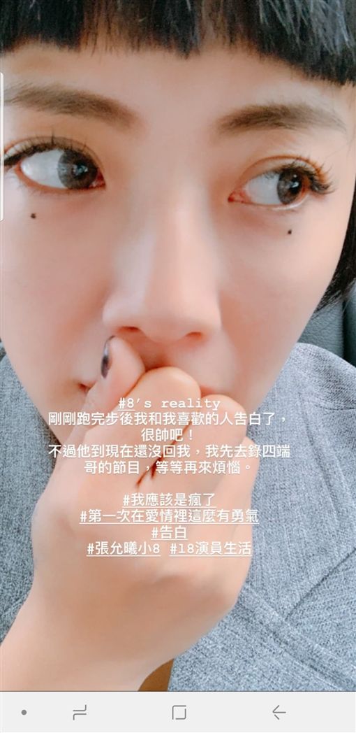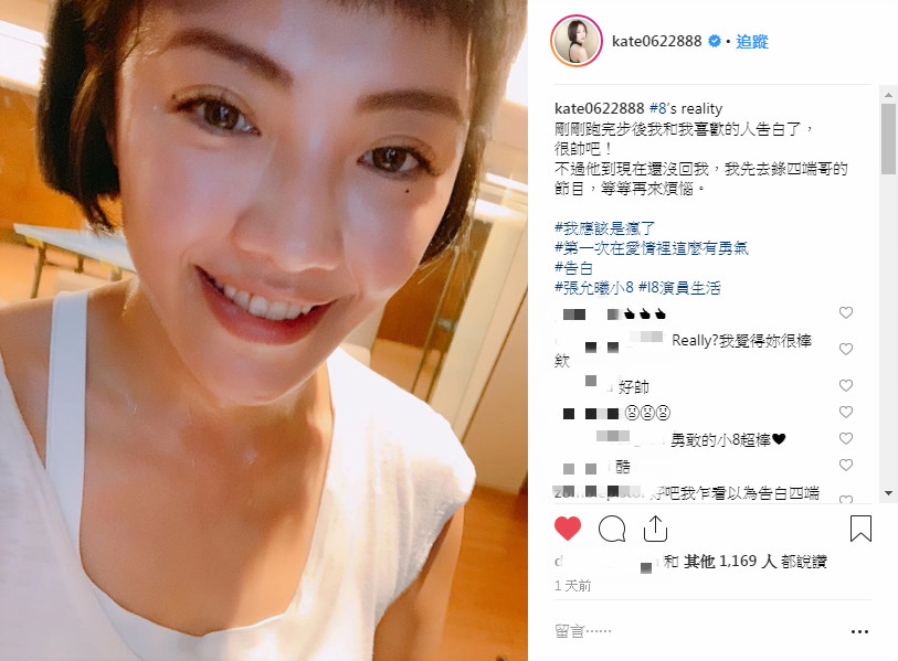 小8昨(13)日在IG透露:「剛剛跑完步後,我和我喜歡的人吿白了!很帥吧!」她表示,雖然對方還沒回應她的感情,但這是她「第一次在愛情裡這麼有勇氣」,剛好她要去錄節目,結果可以「等等再來煩惱」,同時也不忘自嘲「我應該是瘋了!」