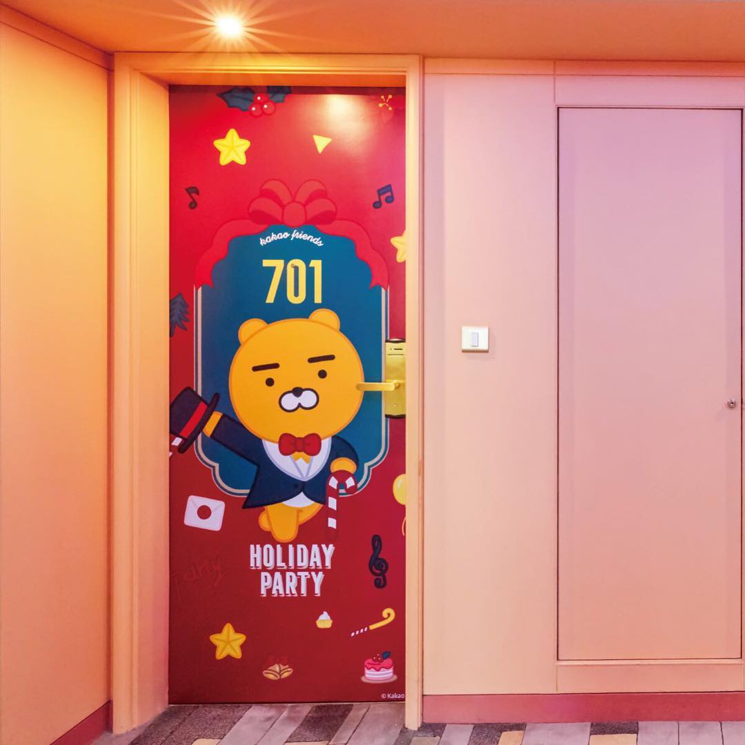 終於抵達「KAKAO FRIENDS主題套房」的門口了。還沒進房就想要直接先把這門板拆下來帶回家~真的太可愛了啦!