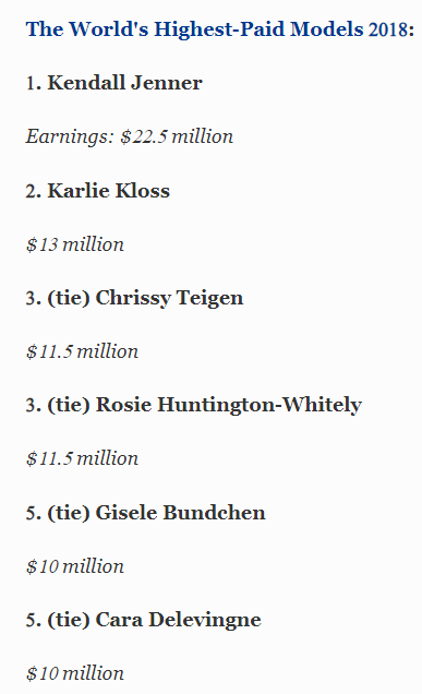 《富比士》公布最賺錢模特兒的排行當中,今年23歲的Kendall Jenner今年再度以2,250萬美元(約6億9433萬台幣)蟬聯冠軍,遠遠勝過排第二位的Karlie Kloss,成為2018年最吸金模特兒,這也令人好奇這些模特兒的背景,其中最讓人想知道Kendall Jenner究竟是如何達成今天的成就?