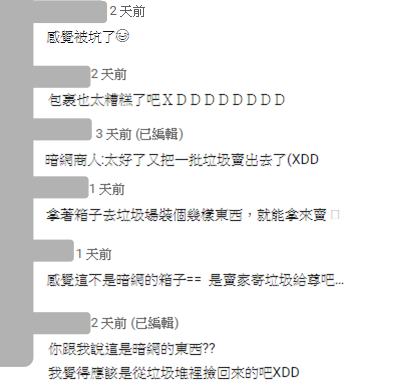 看完影片的網友也紛紛留言:「感覺被坑了」、「包裹也太糟糕了吧」、「暗網商人:太好了又把一批垃圾賣出去了」、「拿著箱子去垃圾場裝個幾樣東西,就能拿來賣」、「感覺這不是暗網的箱子== 是賣家寄垃圾給尊吧…」、「你跟我說這是暗網的東西?? 我覺得應該是從垃圾堆裡撿回來的吧XDD」