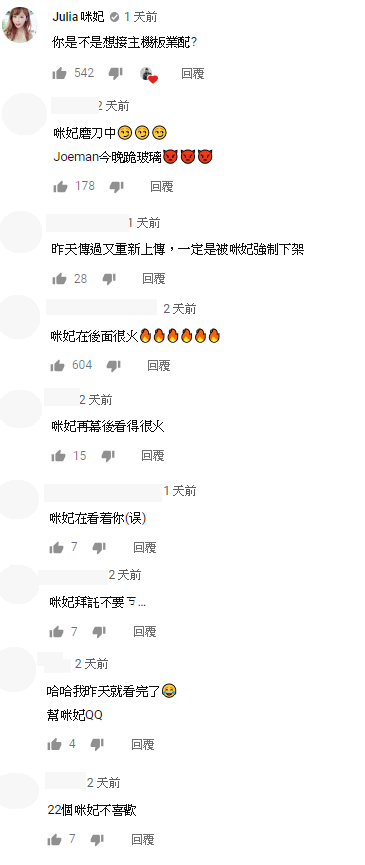 影片播出之後,咪妃也親自留言:「你是不是想接主機板業配」,暗示九妹要跪主機板了,笑翻網友。另一方也有許多網友注意到這支影片已經下架再重傳過,搞笑調侃:「一定是被咪妃強制下架」,只能說粉絲們真的都在幫咪妃盯緊九妹!