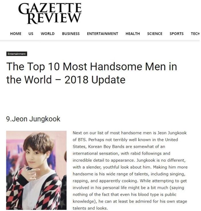 17日,美媒《Gazette Review》公布全球最帥十大美男(The top 10 most handsome men in the world),榜單最大亮點就是東亞唯一獲選者防彈少年團年紀最小的團員田柾國,繼去年成員V獲選美國電影網站「TC Candler」的全球百大帥哥榜首後,防彈再添一位國際認證的美男成員。