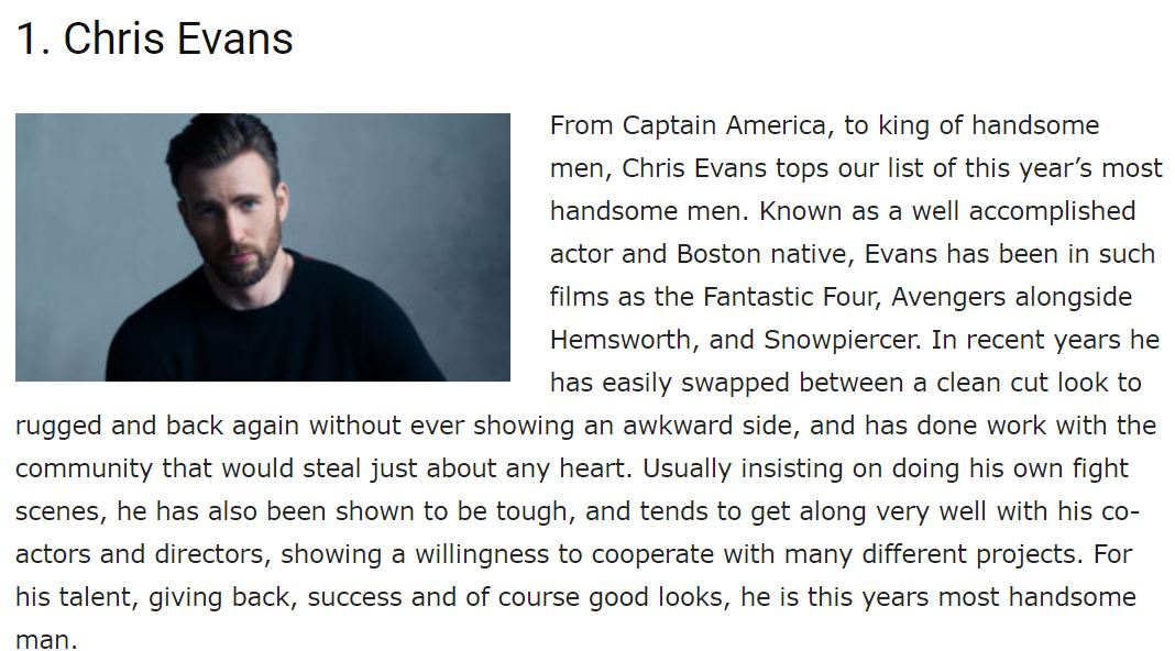 近期美媒《Gazette Review》公布了「全球十大最大美男」該榜單透過專門機構評斷,而不假以觀眾投票,因此被外界認為富有公信力,而評定標準也不僅止於外貌,還考慮多種因素包括才能、財力、成就、信賴程度、堅強等等。