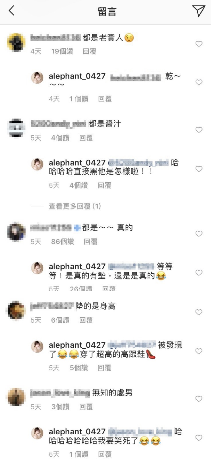 果不其然,非常多粉絲紛紛留言填空,許多網友都非常幽默:「都是老實人」、「都是~~真的」、「墊的是真高」,惹得阿樂也回覆:「乾~~」、「等等等!是真的有墊,還是是真的」、「被發現了 穿了超高的高跟鞋」,不過最有才的網友莫過於,這則填空:「無知的處男」,如此神回覆,讓阿樂開懷大笑:「哈哈哈哈我要笑死了」,看樣子她對網友的回覆很滿意。