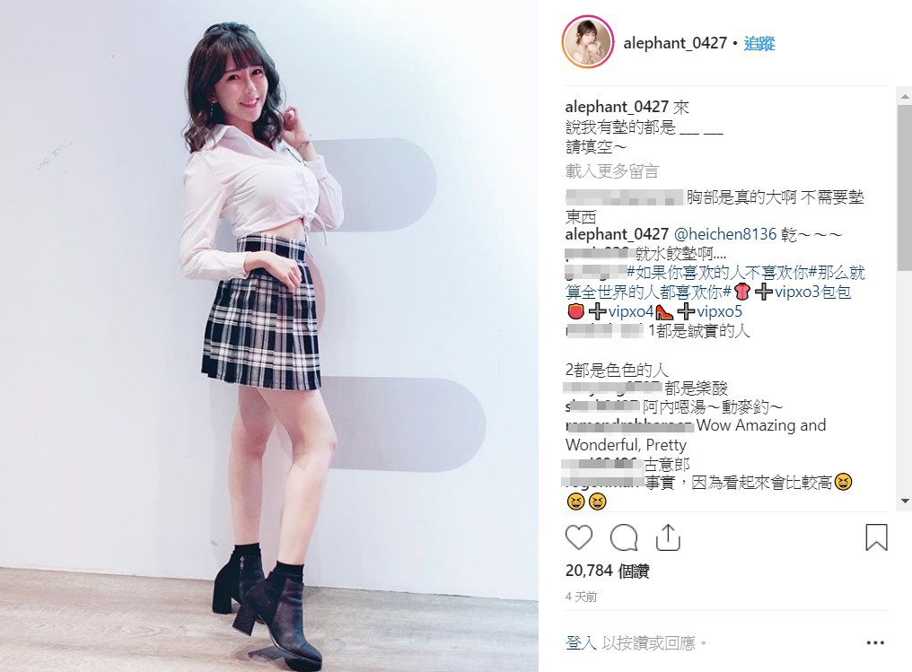 由於過去阿樂時常被調侃這麼傲人的雙峰,是不是因為內衣裡有偷墊?這次她在個人instagarm上PO出,身穿性感白襯衫搭配格子短裙,側乳蹦出超惹火,還加碼露出白皙美腿,使出甜美笑容並說:「來 說我有墊的都是___ ___ 請填空~」特別使出填空題,向之前那些調侃她的粉絲出擊,欲想釣出粉絲回答,她心中想要的答案。