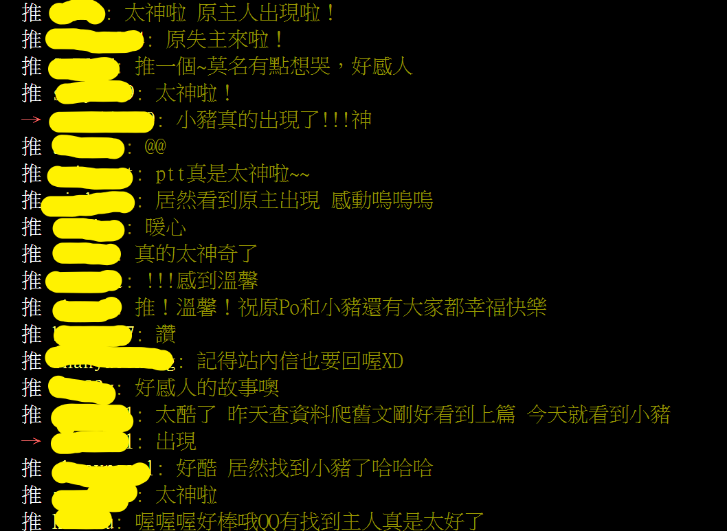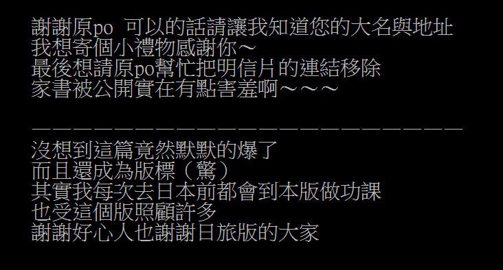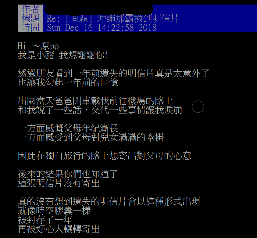 過了幾天後奇蹟的事情發生了,12月16日當初的寫明信片的「小豬」也在PTT的旅日版上PO文,感謝原PO的幫忙,內文寫到:「Hi ~原po我是小豬,我想謝謝你!透過朋友看到一年前遺失的明信片,真是太意外了,也讓我勾起一年前的回憶,出國當天爸爸開車載我前往機場的路上和我說了一些話、交代一些事情讓我淚崩,一方面感慨父母年紀漸長,一方面感受到父母對兒女滿滿的牽掛,因此在獨自旅行的路上想寄出對父母的心意,後來的結果你們也知道了,這張明信片沒有寄出,真的沒有想到遺失的明信片會以這種形式出現,就像時空膠囊一樣被封存了一年再被好心人輾轉寄出,謝謝原po,可以的話請讓我知道您的大名與地址,我想寄個小禮物感謝你~」,這樣宛如電視劇裡的情節,也讓網友感到相當的溫馨。