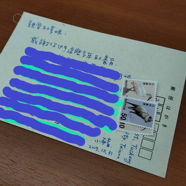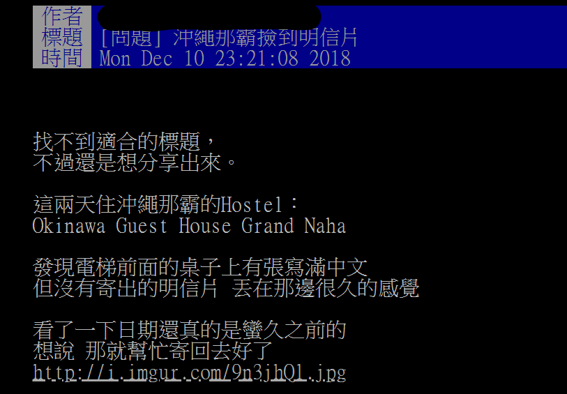 12月10日原PO在PTT的旅日版上PO文,詳細地說了自己遇到的故事,原PO內文寫到:「雖然找不到適合的標題,不過還是想分享出來,這兩天住沖繩那霸的Hostel(Okinawa Guest House Grand Naha),發現電梯前面的桌子上,有張寫滿中文但沒有寄出的明信片 丟在那邊很久的感覺,看了一下日期還真的是蠻久之前的,想說那就幫忙寄回去好了,所以在隔壁的超商買了郵票,然後順手投進附近的郵筒,希望土城的小豬能收到」,還附上了自己拍攝的照片,一張是寄件人寫給父母的告白,另一張則是原PO親手送進郵筒裡的照片,發文底下許多網友也紛紛讚美原PO的舉動,覺得原PO為人非常的好心。